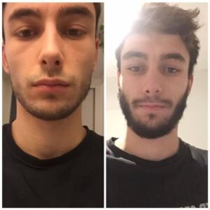 في الصورة الثانية، نفس الشخص أصبح لديه لحية ممتلئة، كثيفة، ومتناسقة بفضل تغذية البصيلات وتنشيط النمو بزيت Nano Absolute.